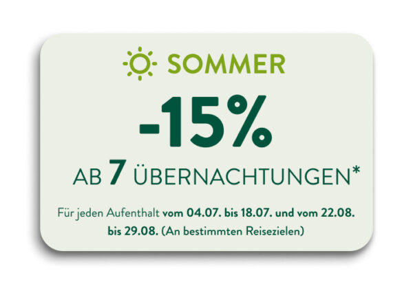 - Profitieren Sie von 15% Rabatt ab 7 gebuchten Nächten in den Randsommerzeiten (04.07.2026 bis 18.07.2026 und 22.08.2026 bis 29.08.2026) auf