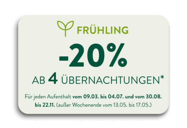 – Profitieren Sie von 20% Rabatt ab 4 gebuchten Nächten zwischen dem 09.03.2026 und dem 01.11.2026 (außer Christi Himmelfahrt und außer Sommer) auf alle Reiseziele