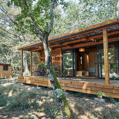Ein einzigartiges Campingerlebnis mit allem benötigten Komfort. Das einladende und schlichte Design fügt sich perfekt in die Umgebung ein. Auf der Holzterrasse können Sie Ihre Mahlzeiten in einer idyllischen Umgebung im Freien einnehmen.