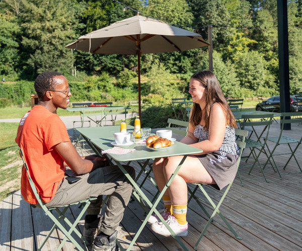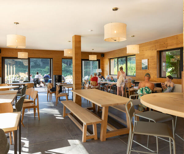 Das Café-Comptoir ist das Herzstück Ihrer kulinarischen Pausen auf dem Campingplatz Huttopia Ouren. Genießen Sie einfache Küche mit belgischen Produkten und Weinen in einer entspannten Atmosphäre.