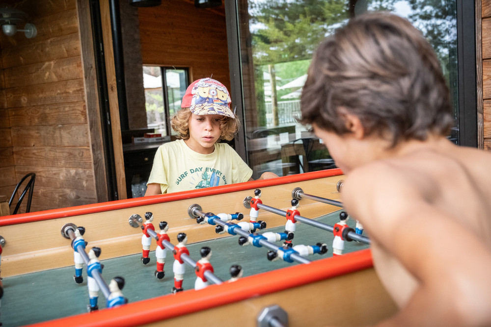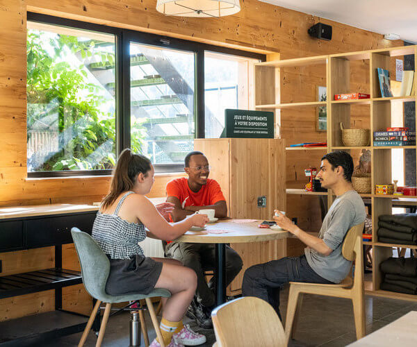 Das „Centre de Vie“, der Gemeinschaftsbereich, ist hell und einladend – der perfekte Ort zum Entspannen: Sofas, Brettspiele, Tischfußball, Bücher… Alles ist für gesellige Momente in authentischer Atmosphäre vorbereitet.