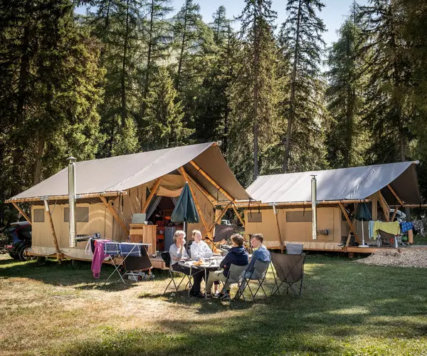 Übernachten Sie in einem Holz & Canvas Zelt, nur wenige Schritte vom Fluss entfernt. Unsere Ready-to-Camp-Zelte verbinden das authentische Campingerlebnis mit dem Komfort von heute: ausgestattete Küchenzeile, bequeme Betten, Terrasse und Holzofen für gemütliche Abende mitten in der Natur.