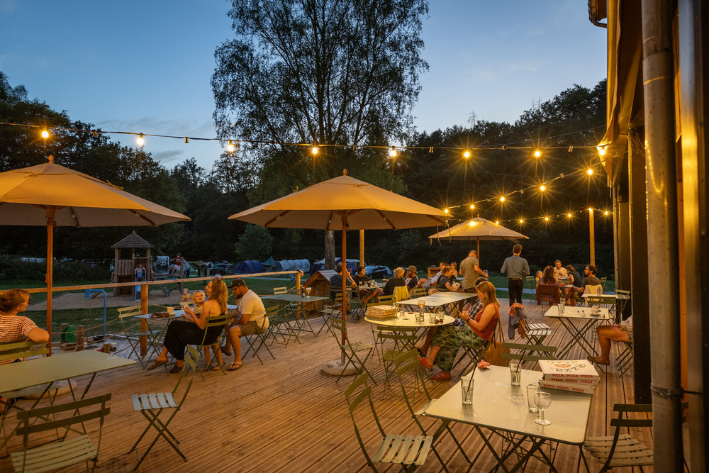 Die Bar serviert Eis, Crêpes, Weine, belgische Biere und kalte Getränke. Genießen Sie Getränke und Speisen auf der Holzterrasse am Fluss oder bei Regen im gemütlichen „Centre de Vie“.