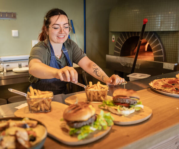 Am Abend nehmen Sie im Café-Resto Platz und lassen Sie sich von unseren hausgemachten Pizzen verführen, zum Vor-Ort-Essen oder zum Mitnehmen.
