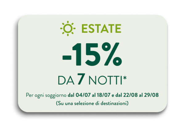 - Approfittate del 15% di sconto da 7 notti prenotate sui periodi intermedi estivi (04/07/2026 al 18/07/2026 e 22/08/2026 al 29/08/2026) su