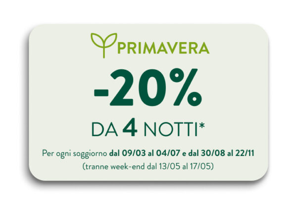 – Approfittate del 20% di sconto da 4 notti prenotate tra il 09/03/2026 e il 01/11/2026 (esclusa Ascensione ed esclusa estate) su tutte le destinazioni