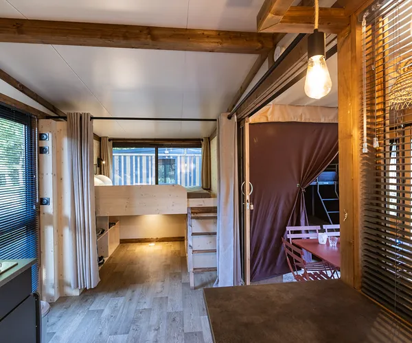 De Arizona combineert het beste van twee werelden: een knus gedeelte van hout met een keukentje, een badkamer en een mooie ouderslaapkamer; en een avontuurlijk gedeelte onder tentdoek met een binnen/buiten leefruimte en een kinderslaapkamer.