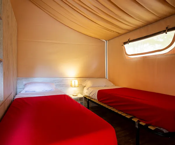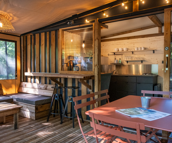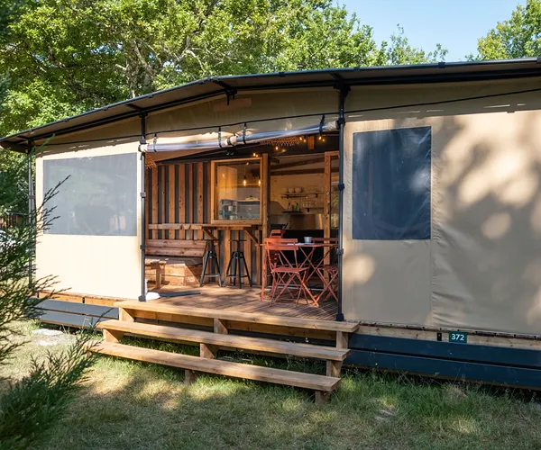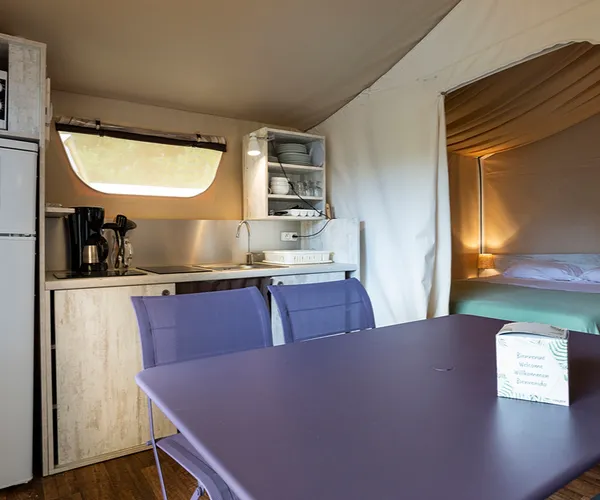 Slaap midden in de natuur, onder het tentdoek, met de luxe van een volledig uitgeruste keuken, een eigen badkamer en natuurlijk een terras om het meer te bewonderen direct vanuit uw stoel, op slechts enkele meters afstand.
