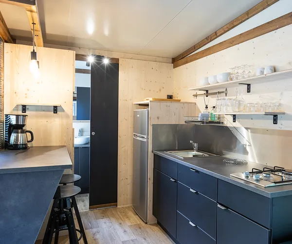 Gezellig houten chalet met veel licht. Met de houtkachel, de vide en het grote terras geniet u in alle seizoenen volop van de natuur. De chalets liggen op een open plek wat verder van het Centre de Vie (ontmoetingsruimte) en zijn perfect geschikt voor wie graag in alle rust wil kamperen.