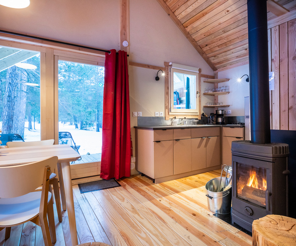 Chaque chalet dispose d’une pièce de vie conviviale avec cuisine équipée, espace repas et poêle à bois pour des soirées douillettes après vos journées au grand air.