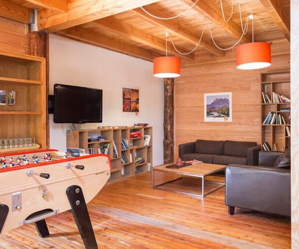 Le Centre de Vie, chaleureux et tout en bois, avec ses grandes baies vitrées ouvertes sur la terrasse, est idéal pour partager des moments conviviaux en famille ou entre amis.