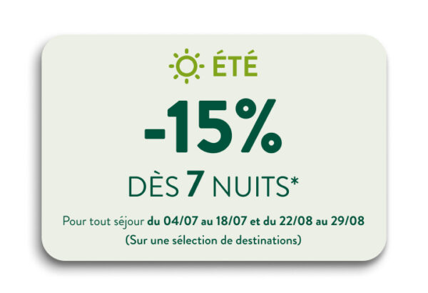 – Profitez de 20% de réduction dès 4 nuits réservées entre le 09/03/2026 et le 01/11/2026 (hors Ascension et hors été) sur toutes les destinations